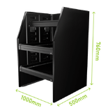Finished in tough black textured powder coat with silver anodised drawer fronts