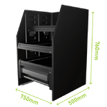 Finished in tough black textured powder coat with silver anodised drawer fronts