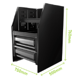 Finished in tough black textured powder coat with silver anodised drawer fronts