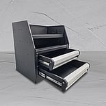 Finished in tough black textured powder coat with silver anodised drawer fronts
