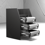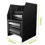 Finished in tough black textured powder coat with silver anodised drawer fronts