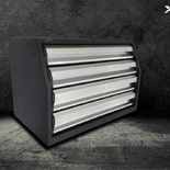Finished in tough black textured powder coat with silver anodised drawer fronts