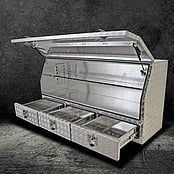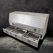 OUR ¾ OPENING TOOLBOX RANGE IS ENGINEERED TO THE HIGHEST QUALITY WITH DESIGNS AVAILABLE IN VARIOUS CONFIGURATIONS (SOME WITH DRAWERS AND ADJUSTABLE SHELVES) FOR ADDED STORAGE SPACE AND ONSITE SECURITY. OUR AFFORDABLE AND DURABLE TA15B 1750MM X 600MM X 850MM UTE TOOLBOX—PROVIDES CONVENIENT ACCESS TO TOOLS WITHOUT NEEDING TO OPEN YOUR TRAY SIDE PANELS.